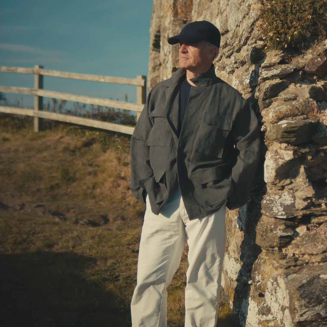 Presented in a Hunter Green colourway, with the same details and functionality as the original FK001. The FK001-Fox Linen Hunter Green Jacket, was inspired by classic militaria style, whereby practicality and functionality is paramount throughout the design process.