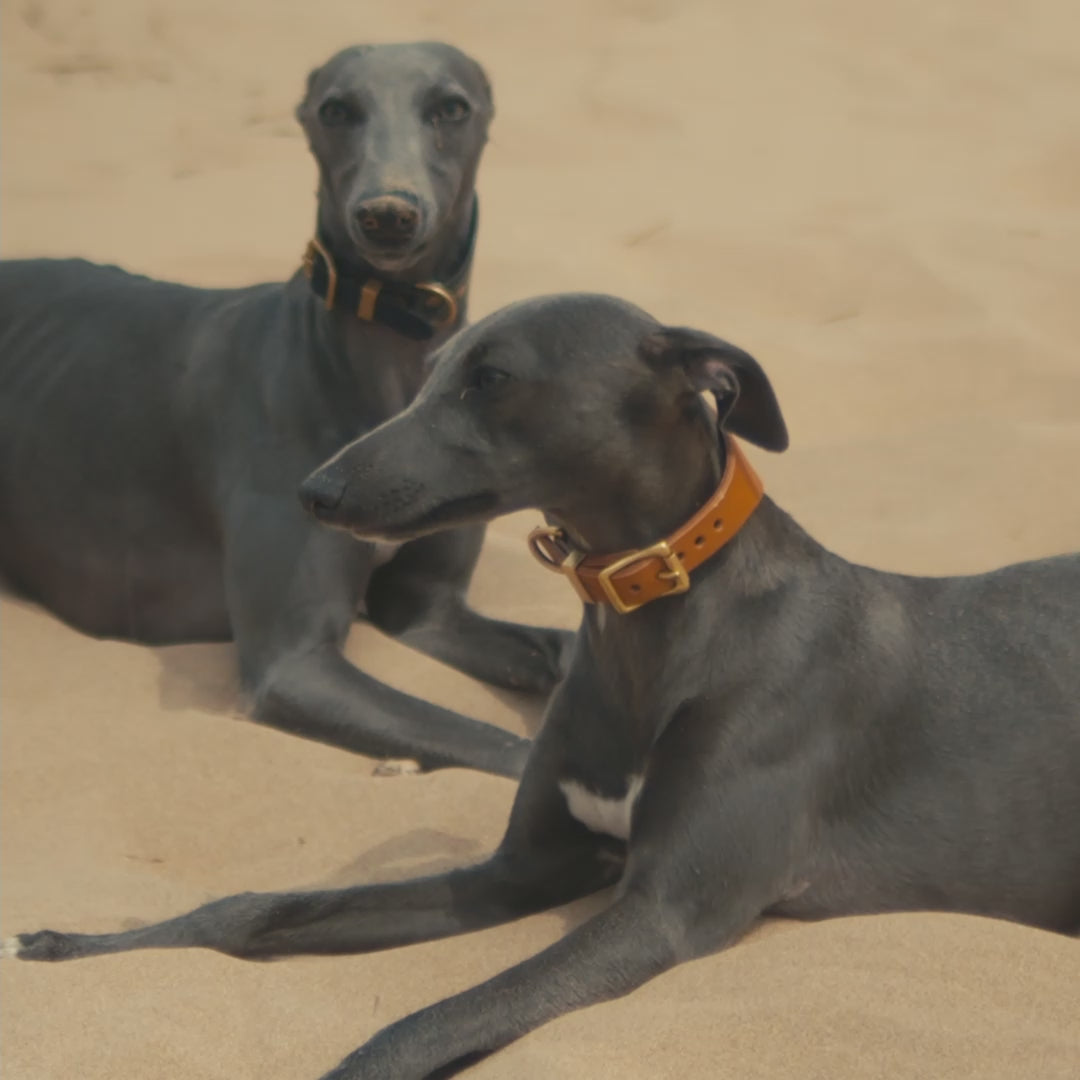 The extra-wide width and oval shape perfectly complements the sighthound breed, and it will only look better with age, as the collar develops a beautiful mellow tone and moulds to your dog through many adventures.
